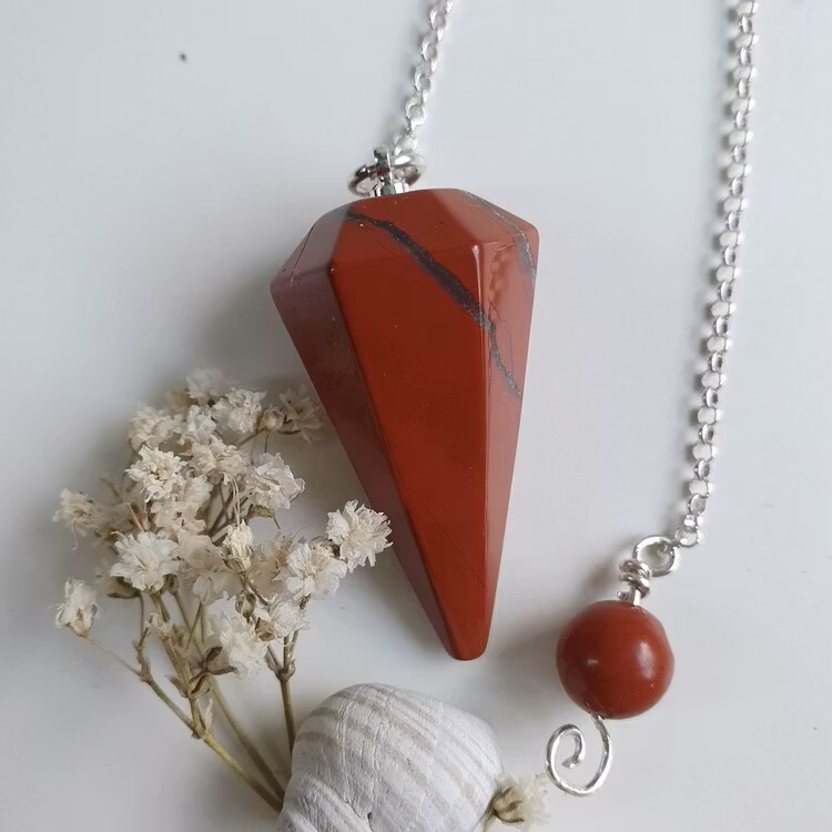 Fin pendel av Röd Jaspis. Levereras i en skyddande påse. Vi väljer en fin pendel åt dig.