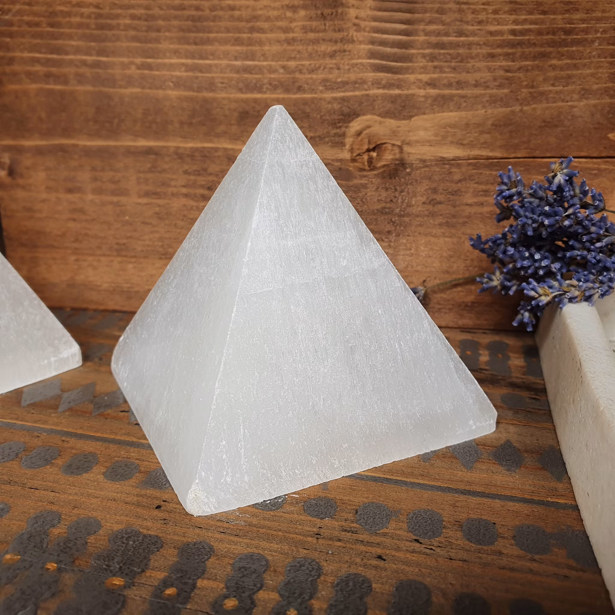 Pyramid av Selenit. Notera att Selenit är ett skört material och naggar kan framträda. Vi får in naggade bitar av selenit från grossist, så det är svårt att undvika. Jag packar supersäkert i kartong med massor av bubbelplast för att minimera risken.