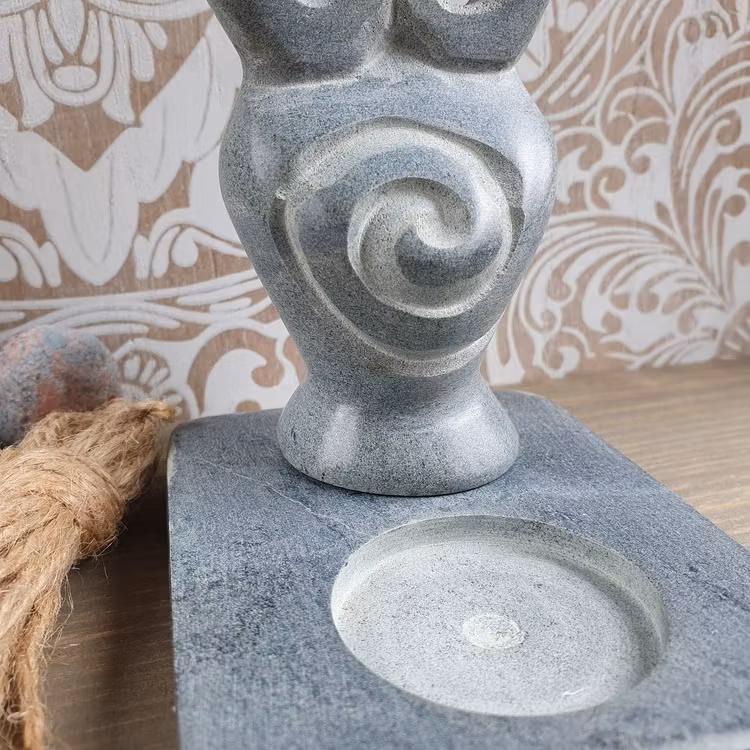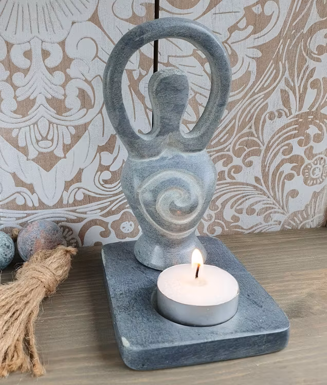 Ljuvlig Gudinnestatyett i grått med plats för värmeljus av täljsten som står för bland annat fruktbarhet. Vi väljer en vacker gudinna åt dig.
