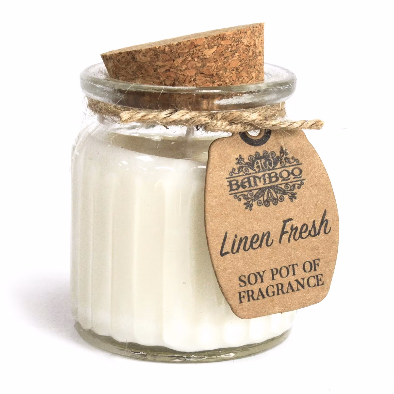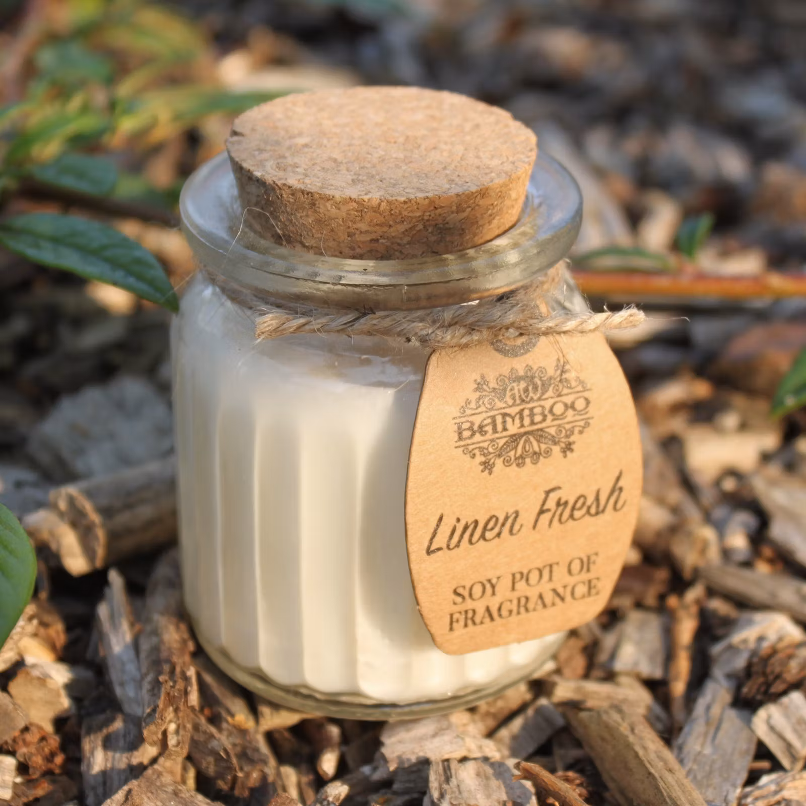 Doftljus utav sojavax med 3% doft av eterisk olja. Ljuset kommer i en liten glasburk med tillhörande lock av kork.