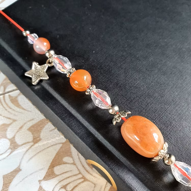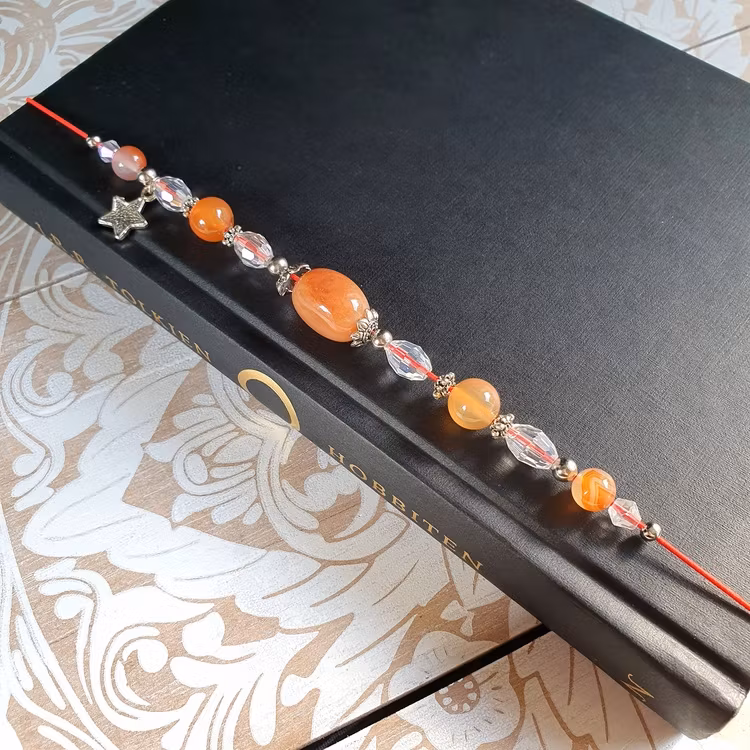 Ett superfint bokmärke av Karneol, metall och akrylpärlor på elastisk tråd.