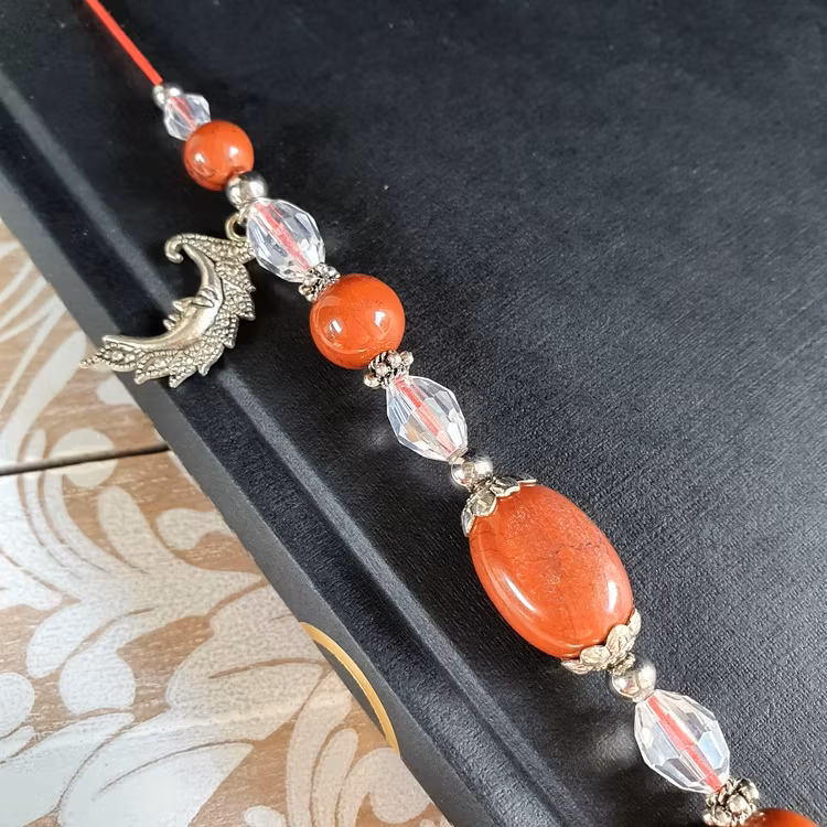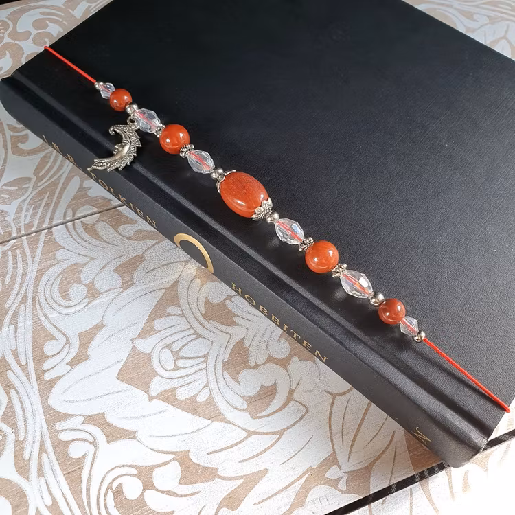 Ett superfint bokmärke av Röd Jaspis, metall och akrylpärlor på elastisk tråd.