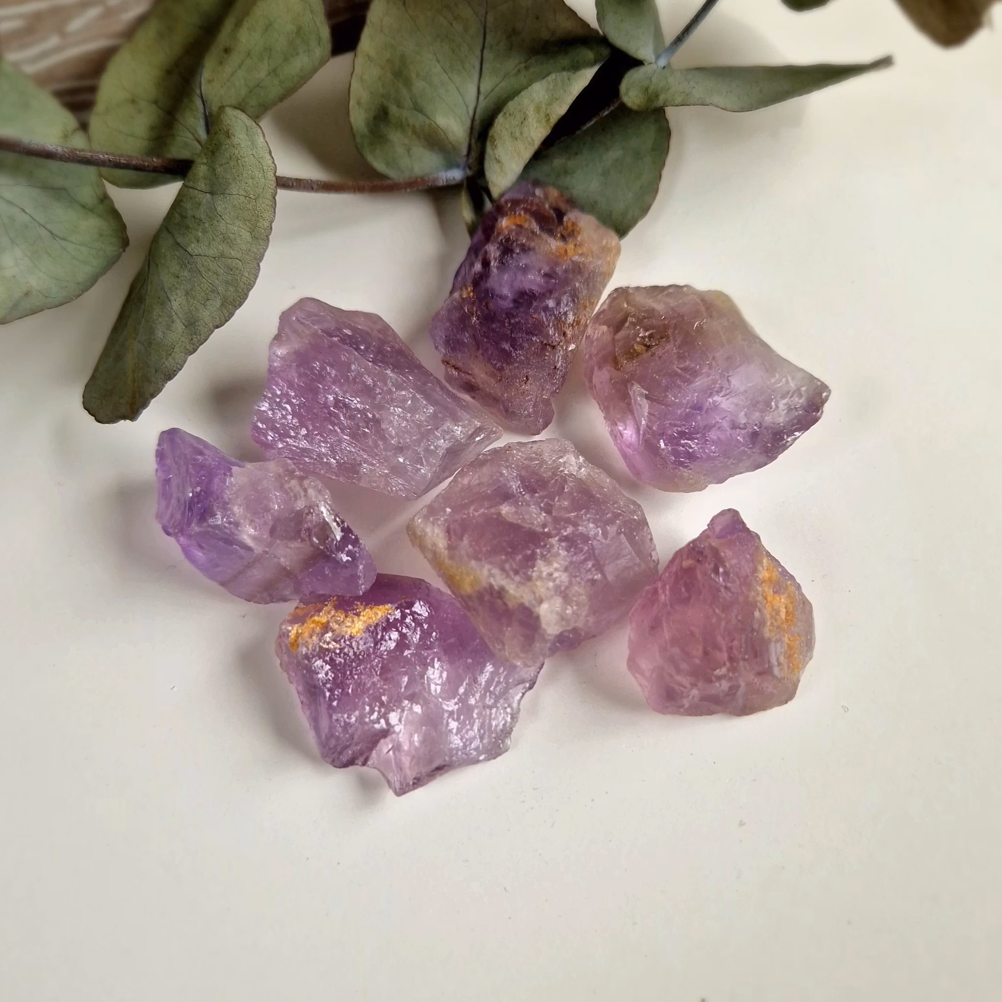 Rå bitar av Ametist. Dessa stenar är ytbehandlade med ett tunt lager olja och passar därför inte til elixir. Vi väljer en fin sten åt dig.