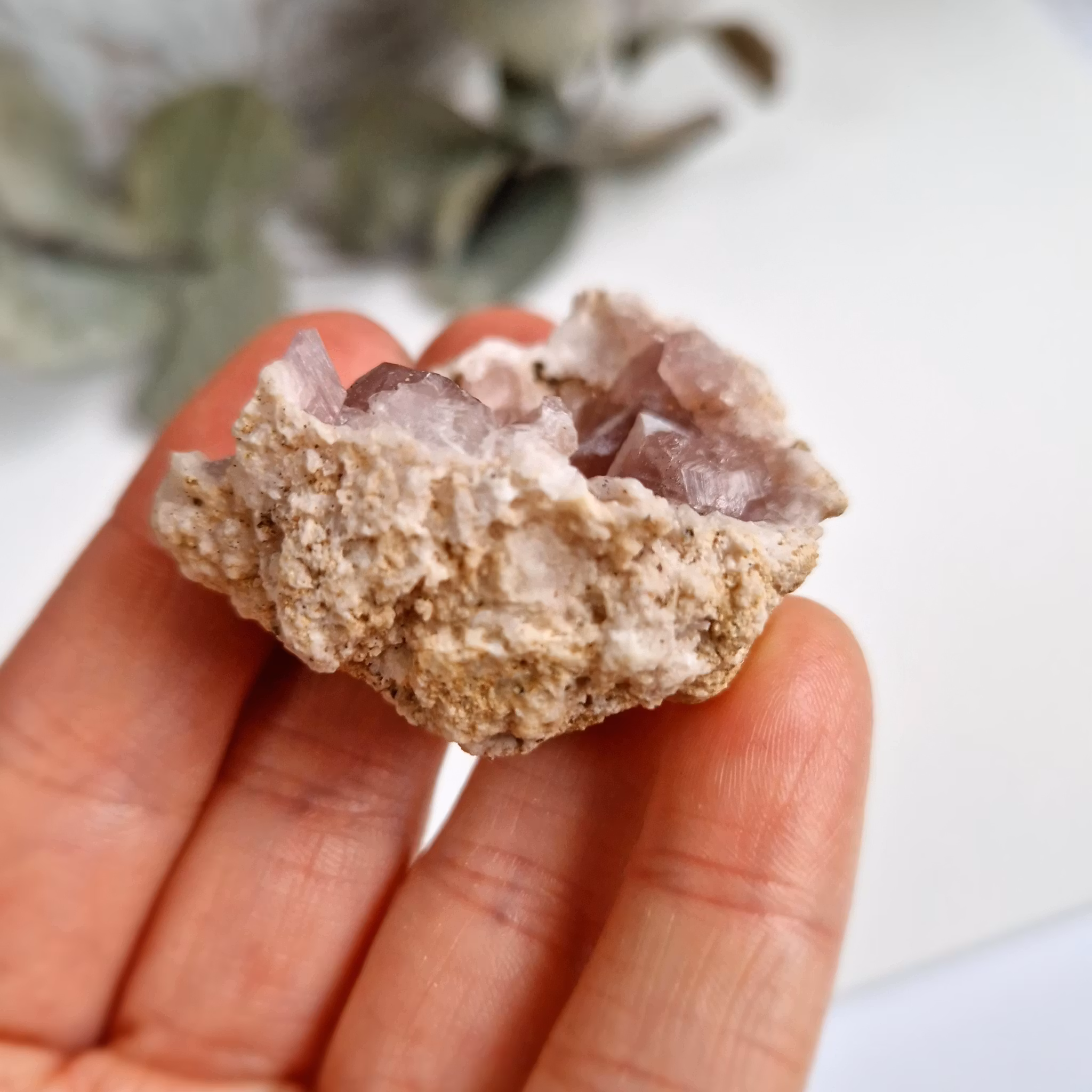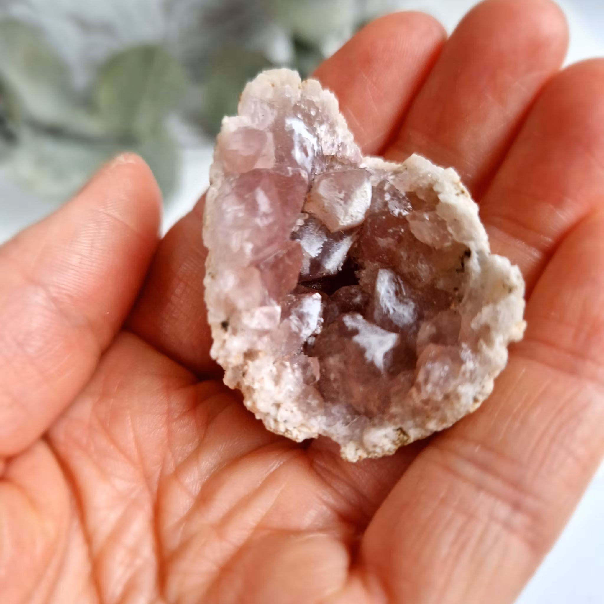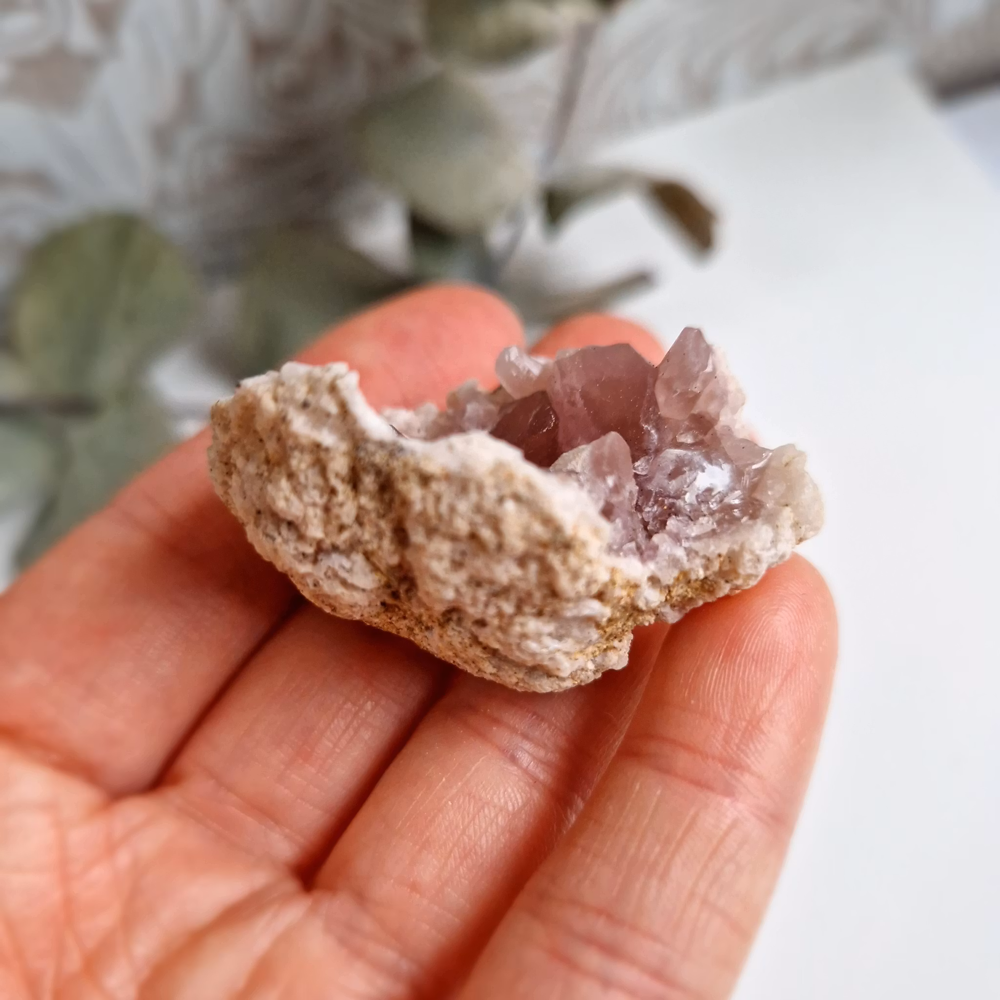 Geod av Rosa ametist i mycket fin kvalitet. Rosa ametist i geod är sällsynt och upptäcktes så sen som 2019. Ett litet kort ned information om stenens ursprung följer med i en liten presentbox.