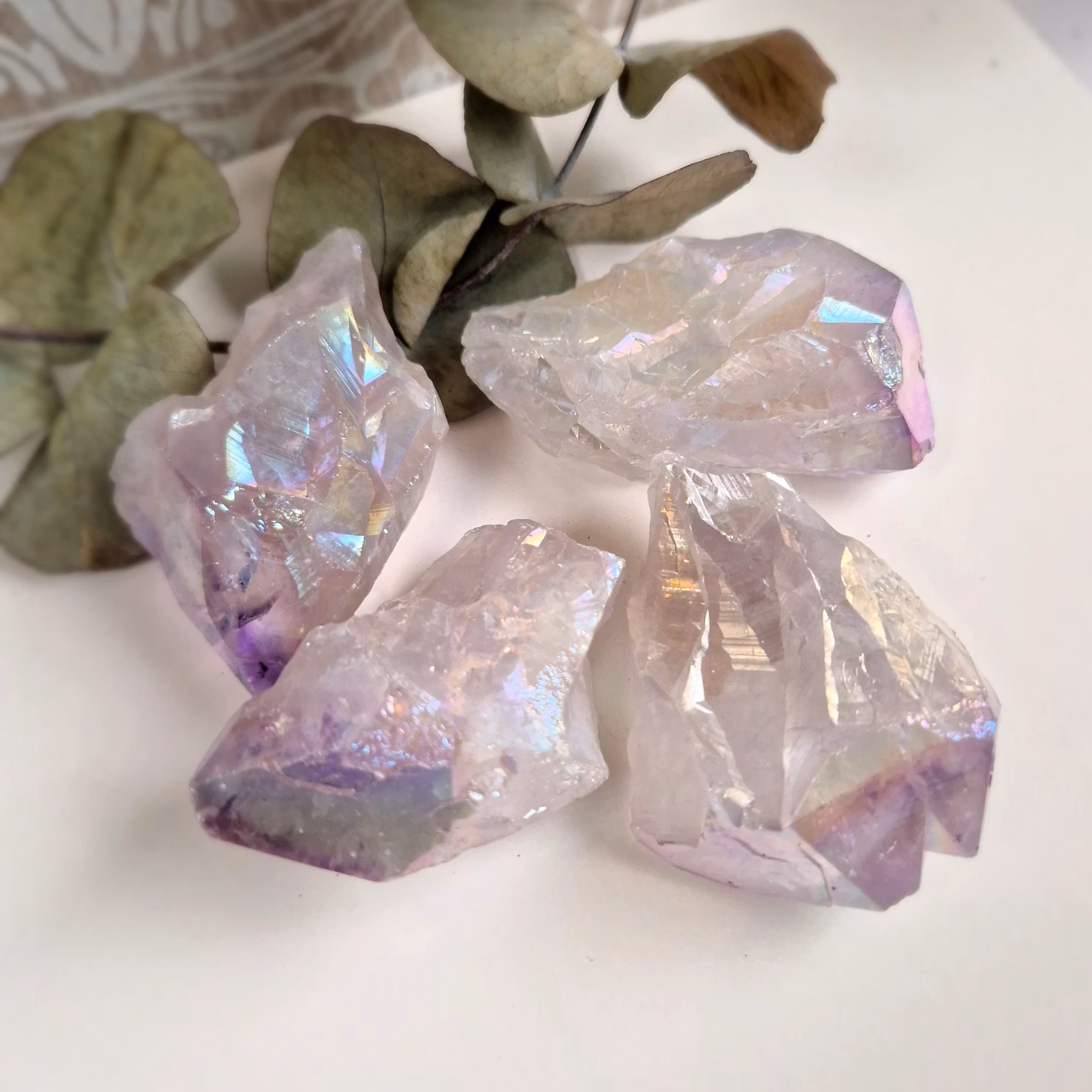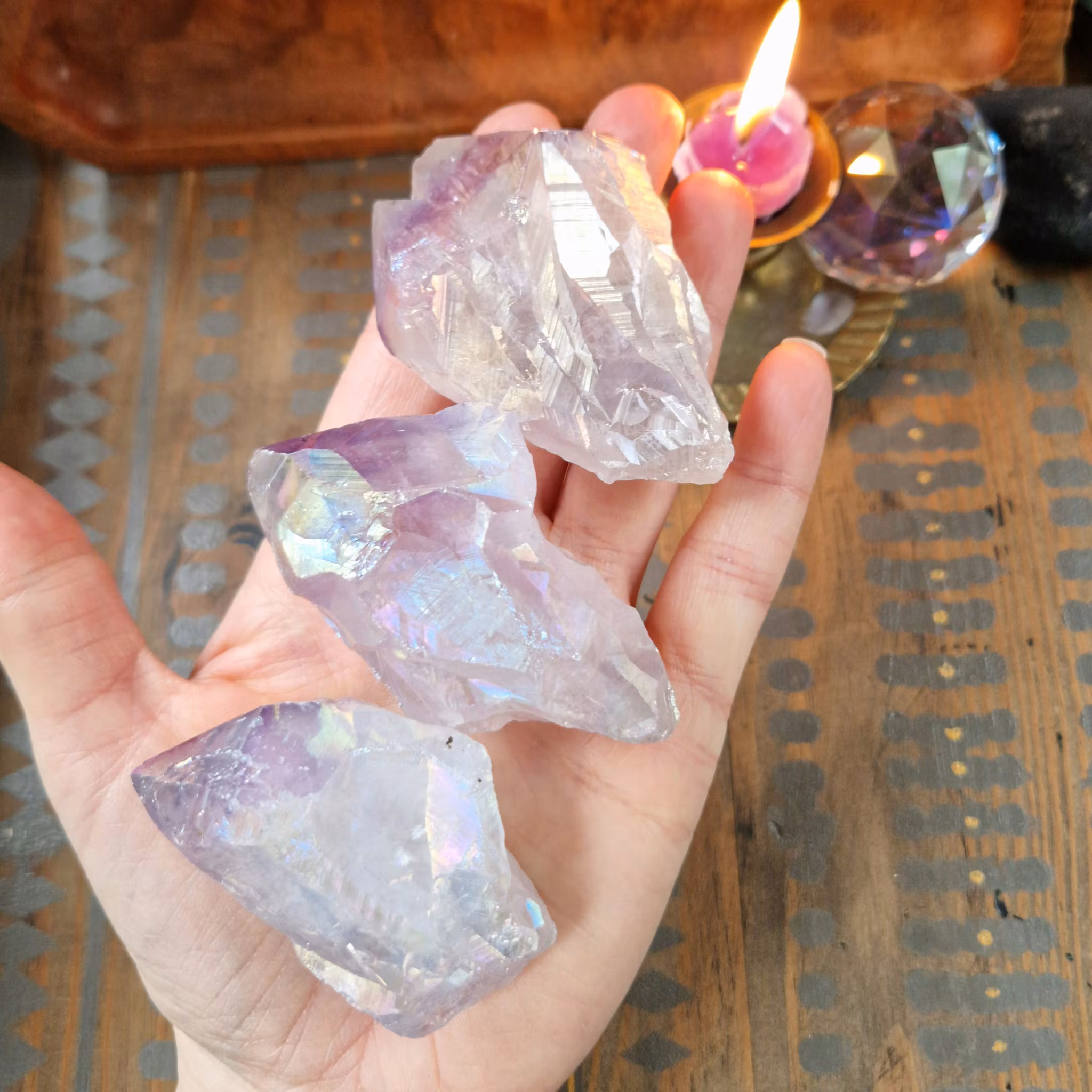 Rå fin spets i Ametist Aura i A-kvalitet. Aura kvarts som är alla typer av kvarts behandlad i vakuum med guld, silver och platina på hög värme för att ge det regnbågsfärgade skimret. Vi väljer en fin sten åt dig.