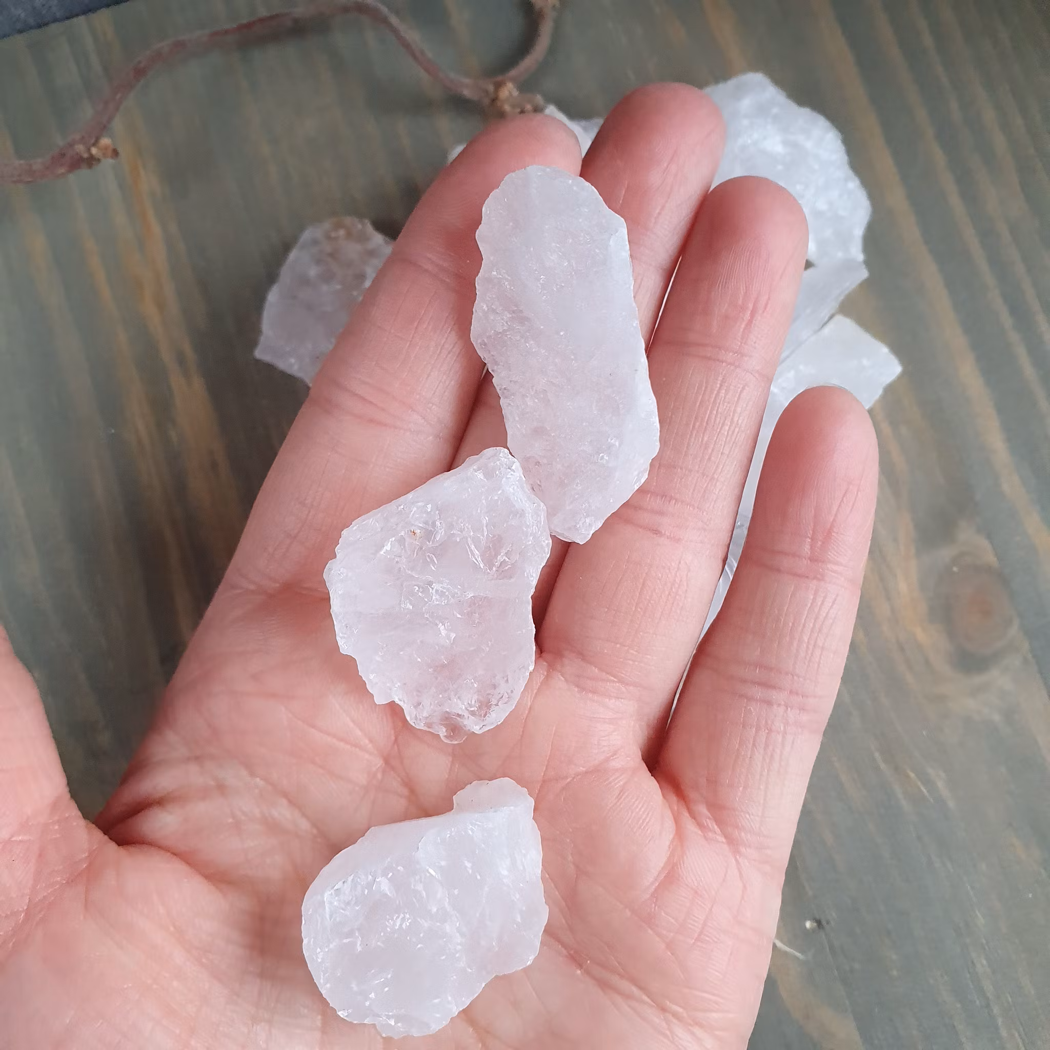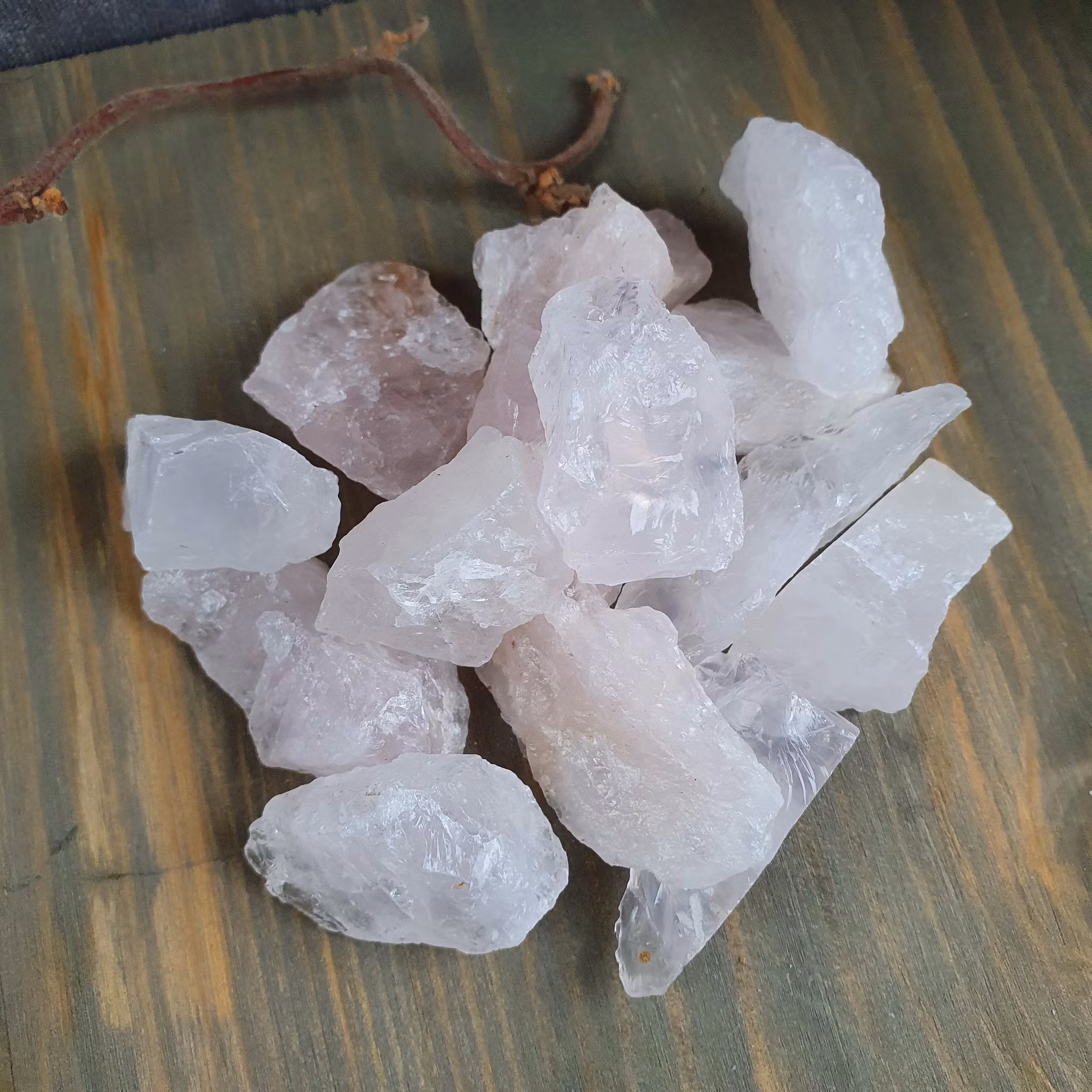 Rå rosenkvartschips i en ljusare ton i påse om 100 gr. För dekoration, kristallnät mm.