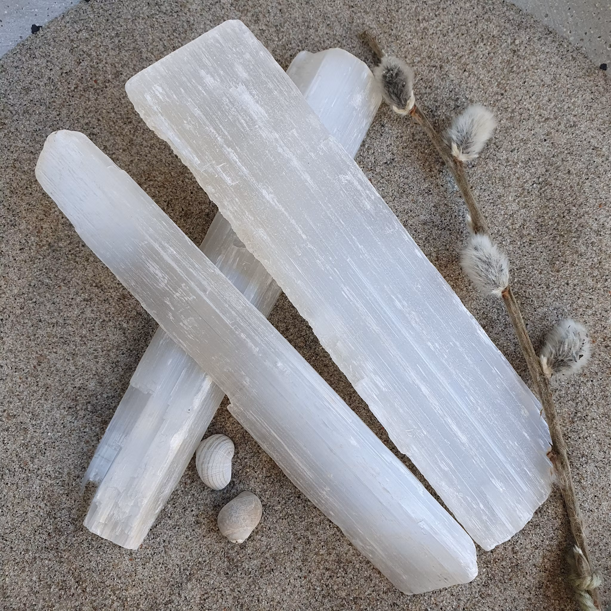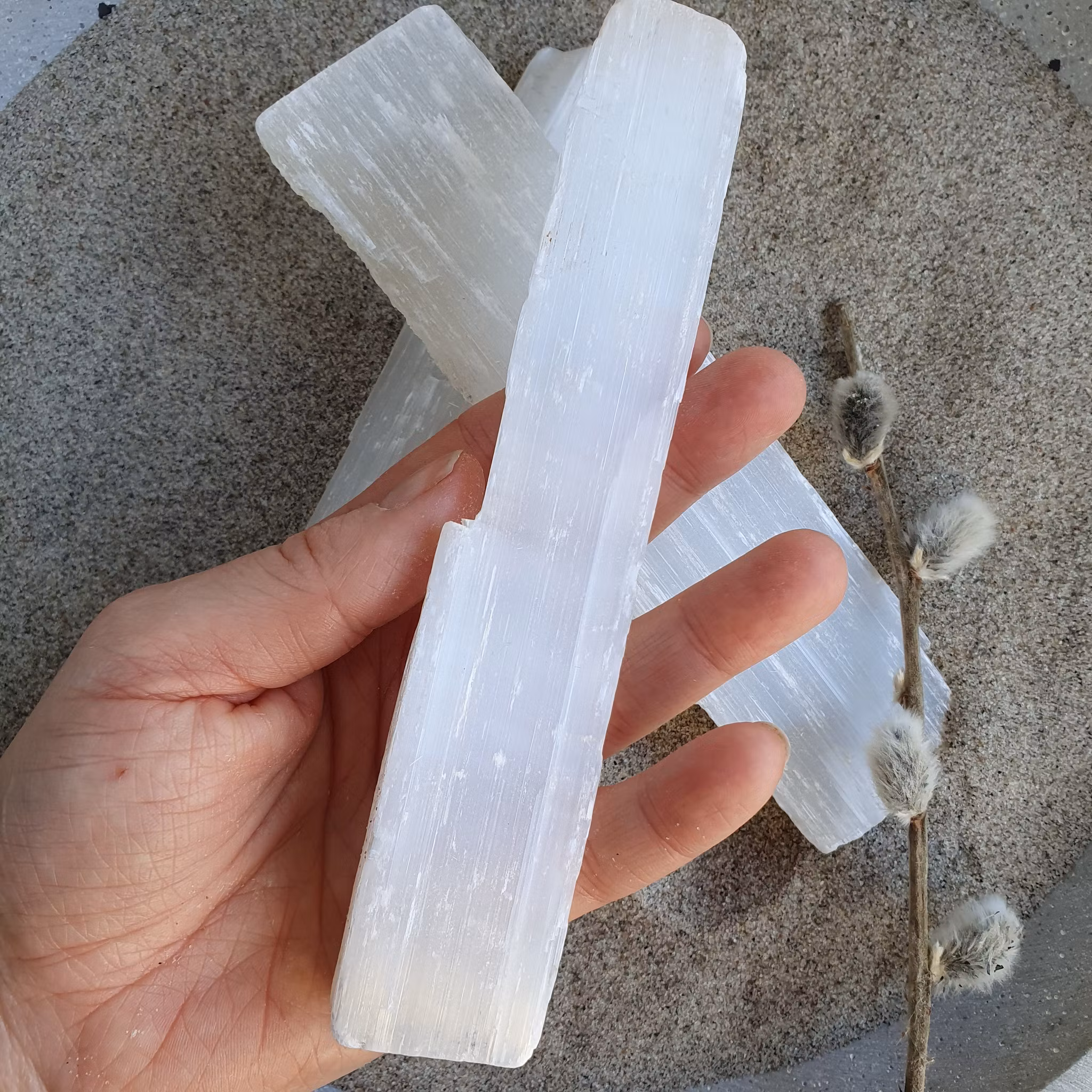 Stav av Selenit. En sten som atbetar med de högre chakrorna. Stödjer meditationsarbete och renar dig själv och din omgivning. En mineral som är ett måste i din samling.