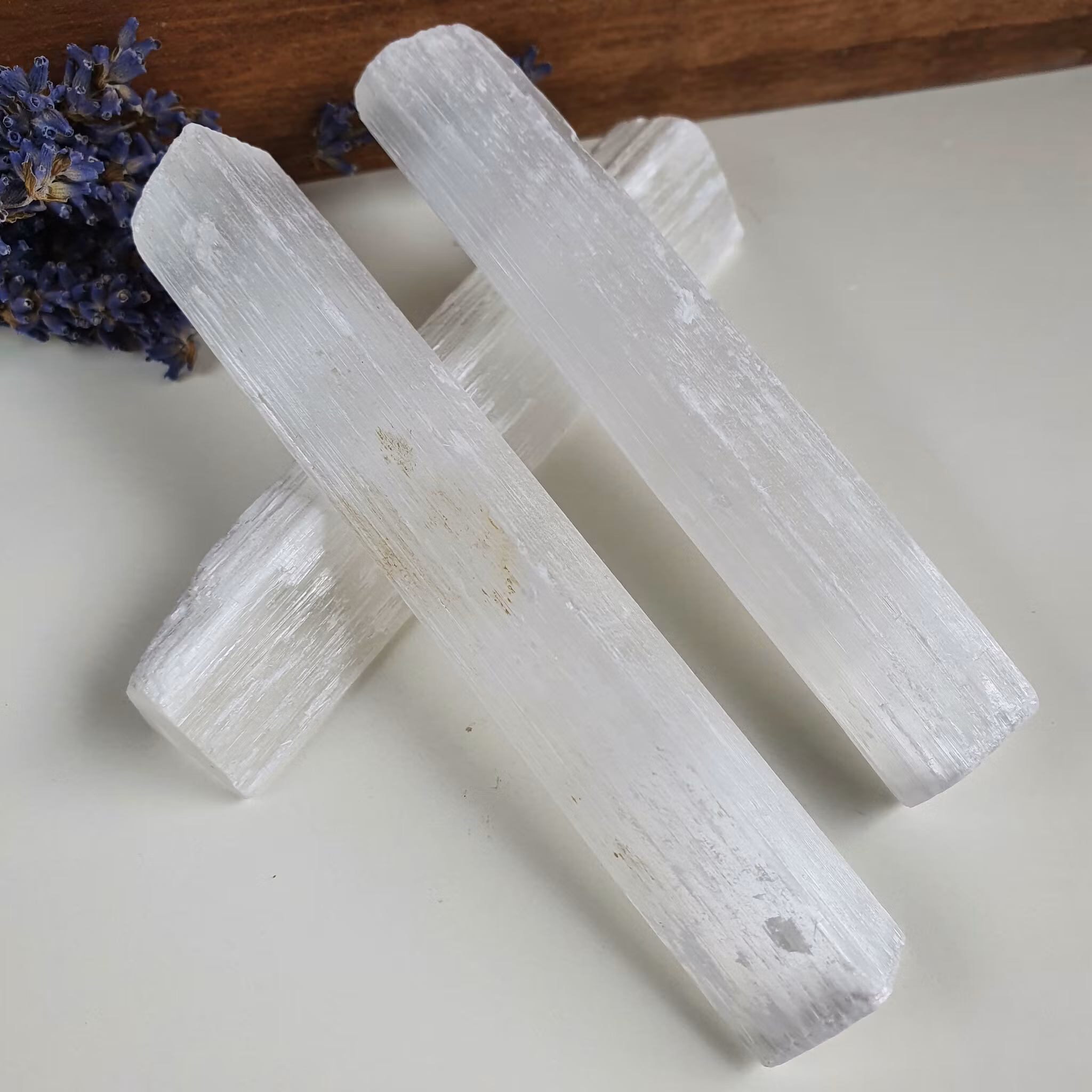 Stav av Selenit. En sten som atbetar med de högre chakrorna. Stödjer meditationsarbete och renar dig själv och din omgivning. En mineral som är ett måste i din samling.