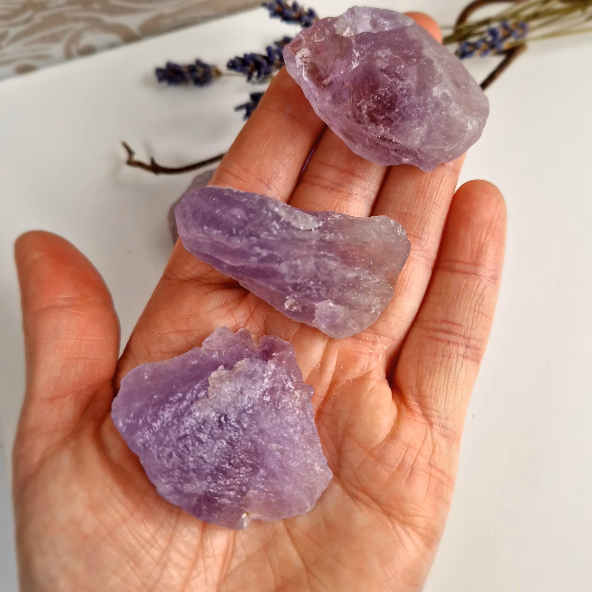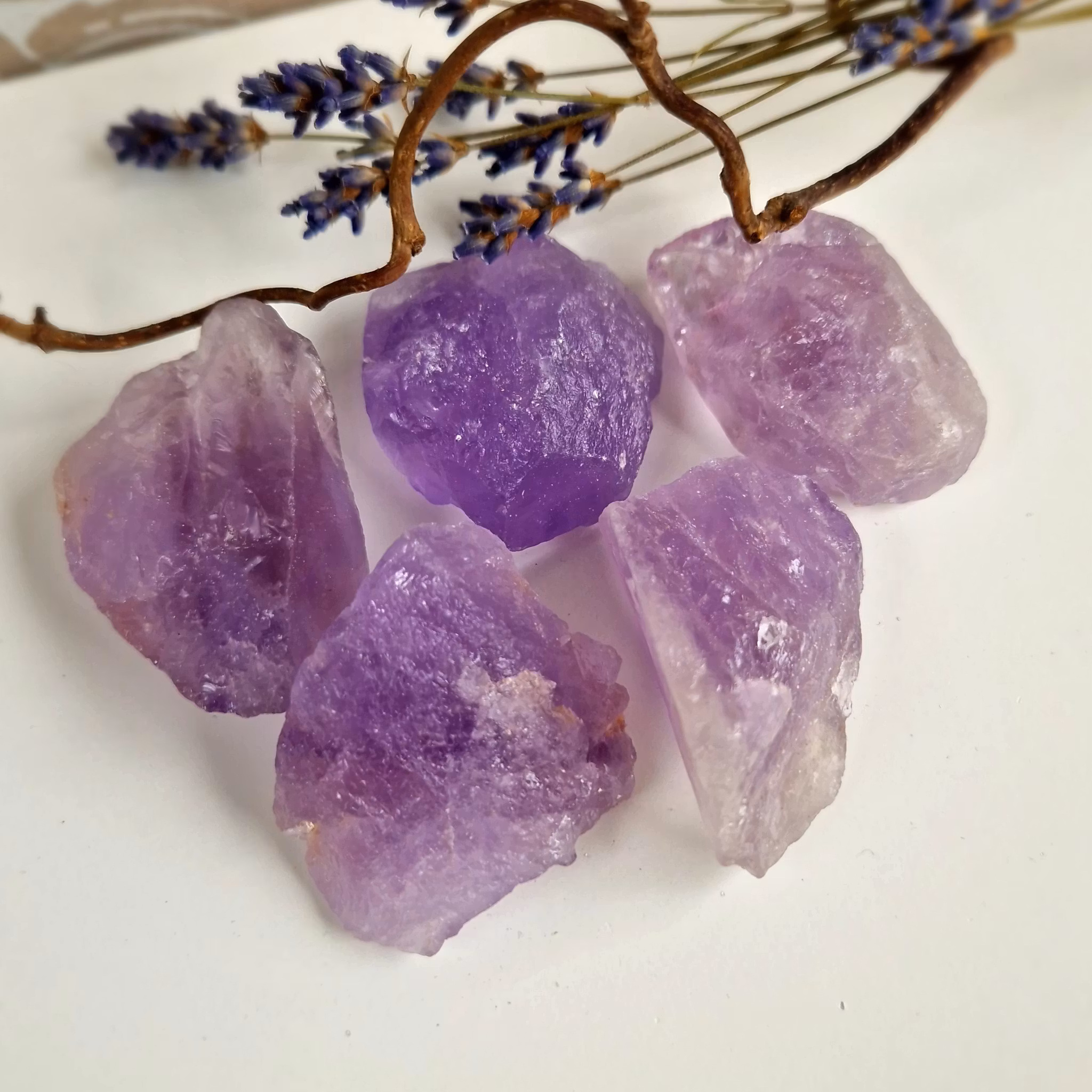 Rå bitar av Ametist. Dessa stena är ytbehandlade med ett tunt lager olja och passar därför inte till elixir. Vi väljer en fin sten åt dig.