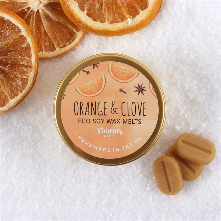 Handgjort doftvax från England i en plåtburk med skruvlock och med 12 små doftbönor i varje. Doft: Apelsin, nejlika och stjärnanis.