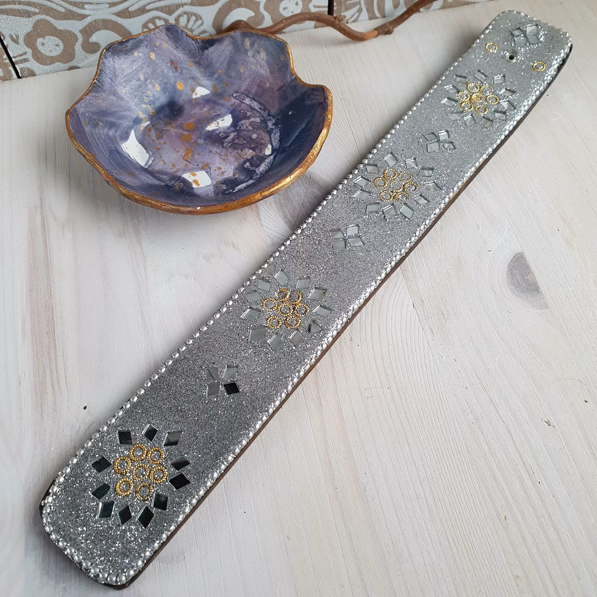 1 st glittrig rökelsehållare för stickor av sheeshamträ. Varje hållare är handgjord och därför ser inte all identiska ut med fotot. Små ojämnheter kan förekomma.