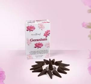 " Fill your home with the bright and zesty aroma of Stamford Geranium Incense Cones. The fragrance of geranium is leafy, earthy, green, rich rose and minty."