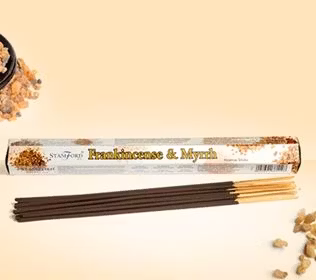 "The magical scent of Stamford Hex Frankincense and Myrrh Incense Sticks creates a lush, sensual atmosphere perfect for indulgent entertaining and blissful relaxation."