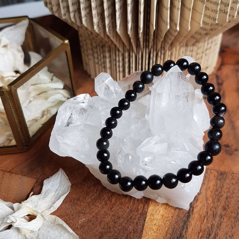 Vackert armband med Snöflingeobsidian trätt på elastisk tråd.