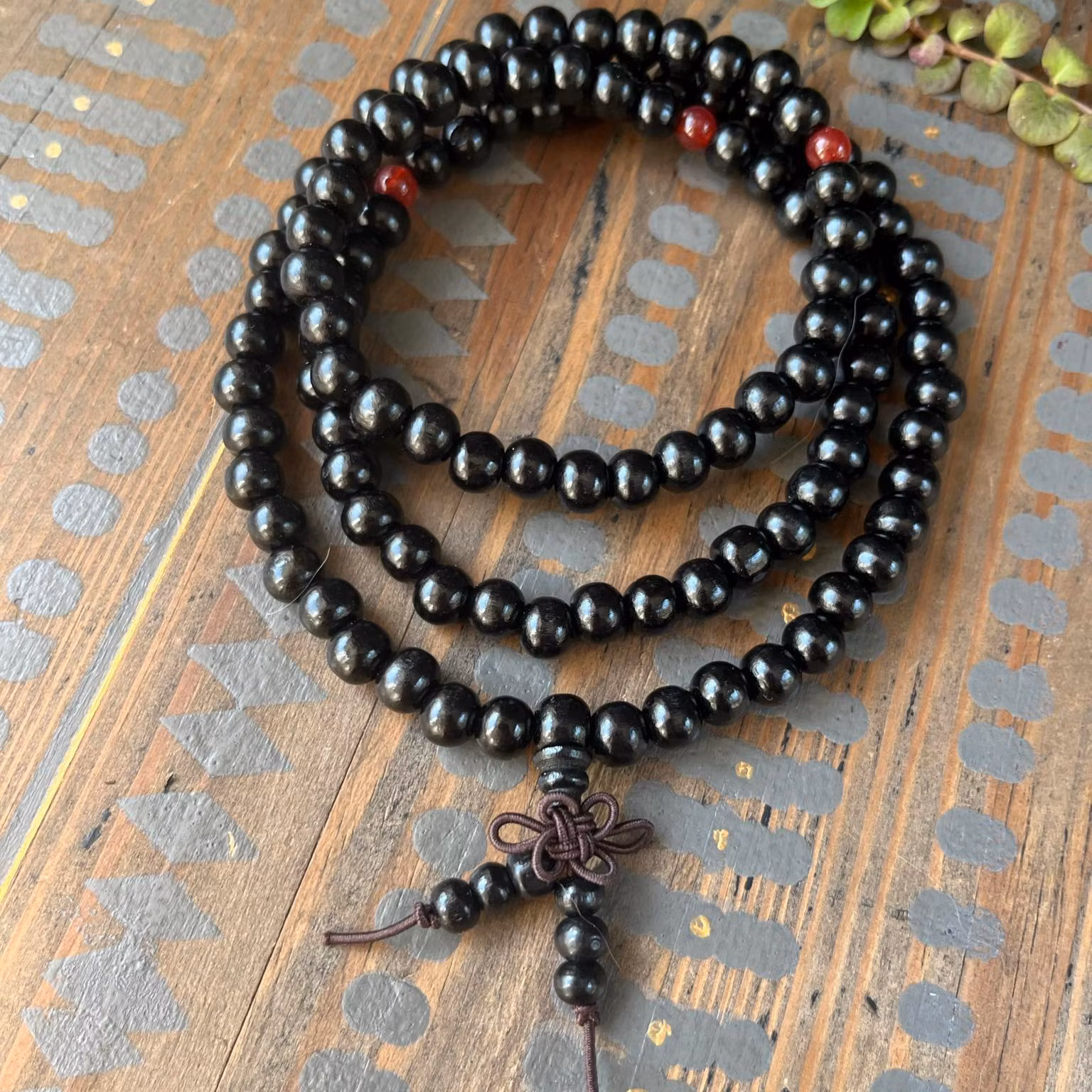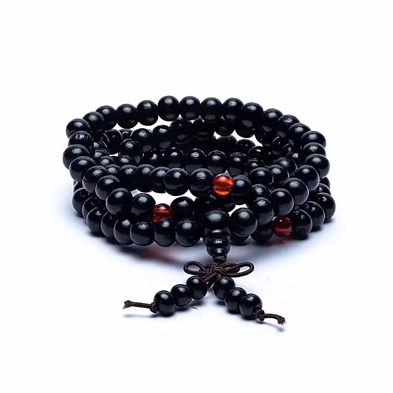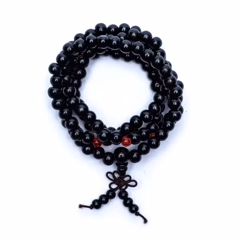 Mala av träpärlor, trätt på elastisk tråd, Malan användes traditionellt inom Buddhismen som ett böneband, där man räknar pärlor med tummen vid varje mantra man yttrar. Mantrat upprepas 108 gånger, därför består halsbandet av 108 baspärlor. Malan kan både användas som halsband och armband.