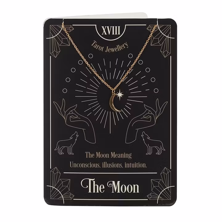 Vacker halsband i guldfärgat står i motiv av The moon från Tarot. Halsbandet sitter fast på ett kort där man kan skriva en hälsning, samt ett kuvert av guld, vilket gör den perfekt som gåva.