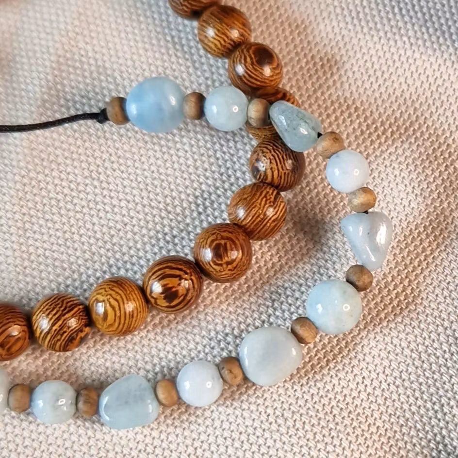 Armband med Akvamarin och träpärlor i makrame, Onesize XS-L