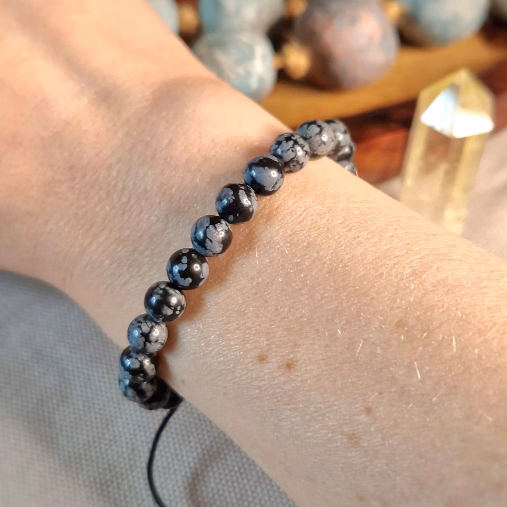 Armband med Snöflingeobsidian och träpärlor i makrame, Onesize XS-L