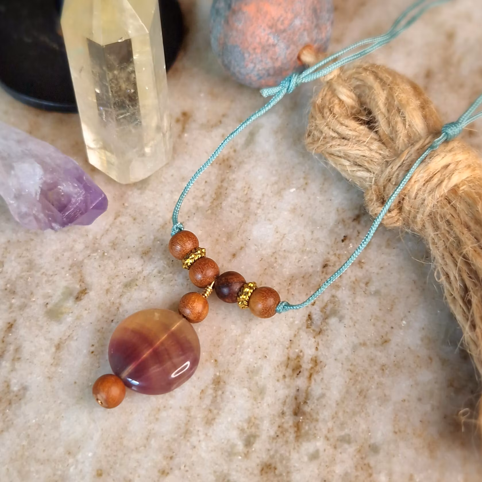 Ställbart Halsband, Regnbågsfluorit och sandelträ i makrame, Onesize