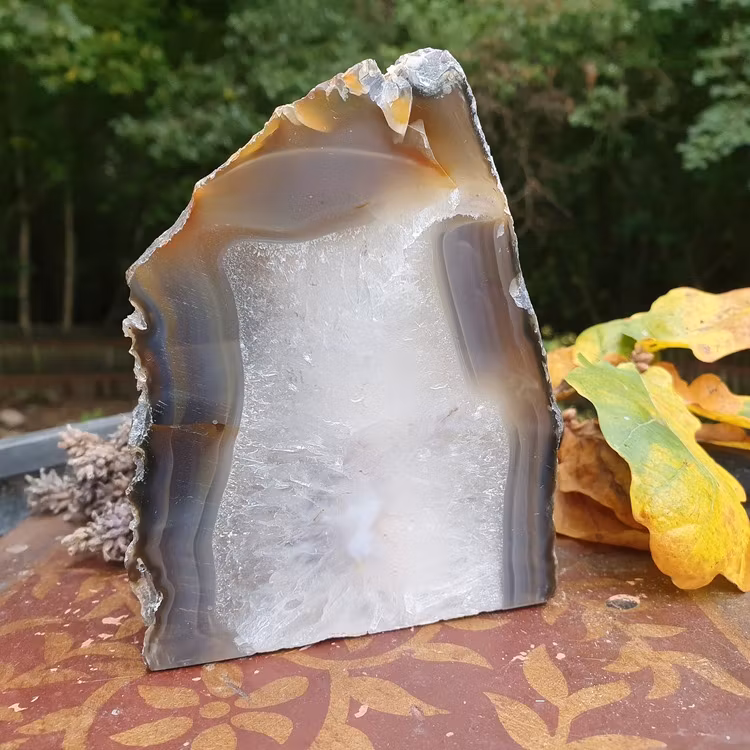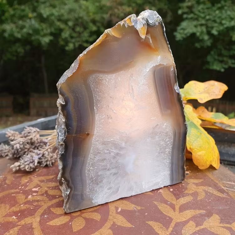 En vacker ljuslykta av ofärgad agat som ger ett stämningsfullt sken genom sin polerade framsida. Lyktan på bilden är den du köper.