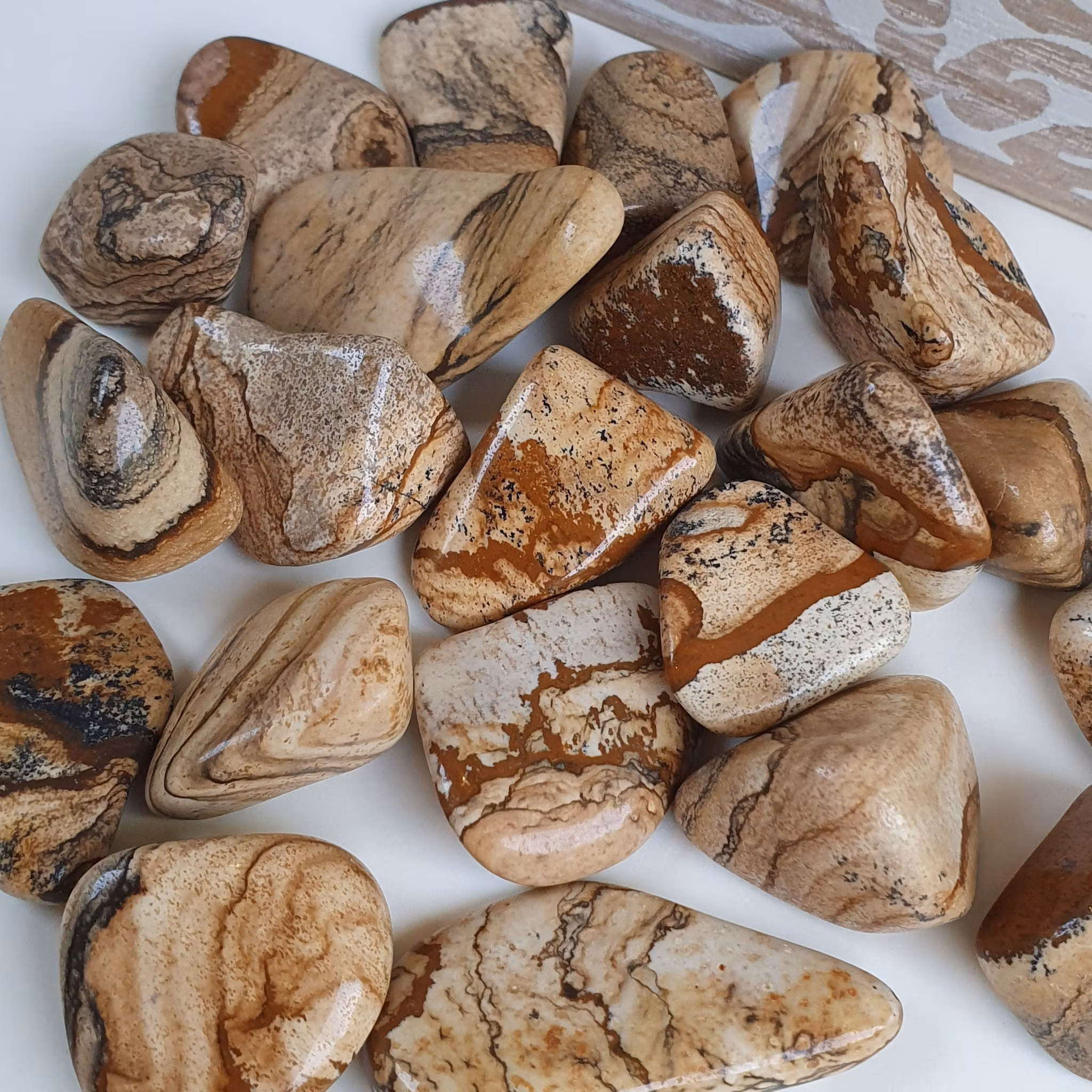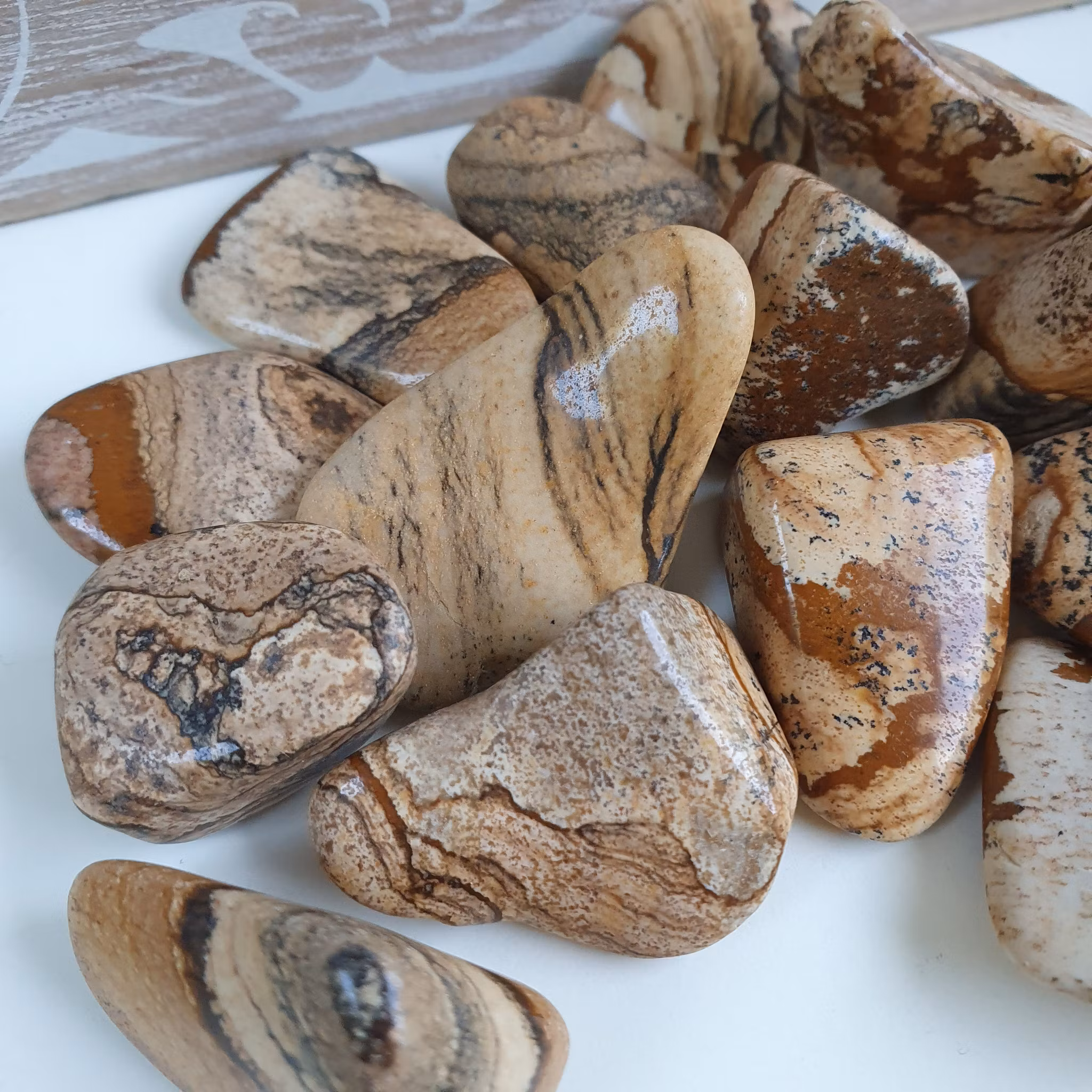 Fin bit av trumlad landskapsjaspis A kvalitet. Vi väljer en fin sten åt dig.