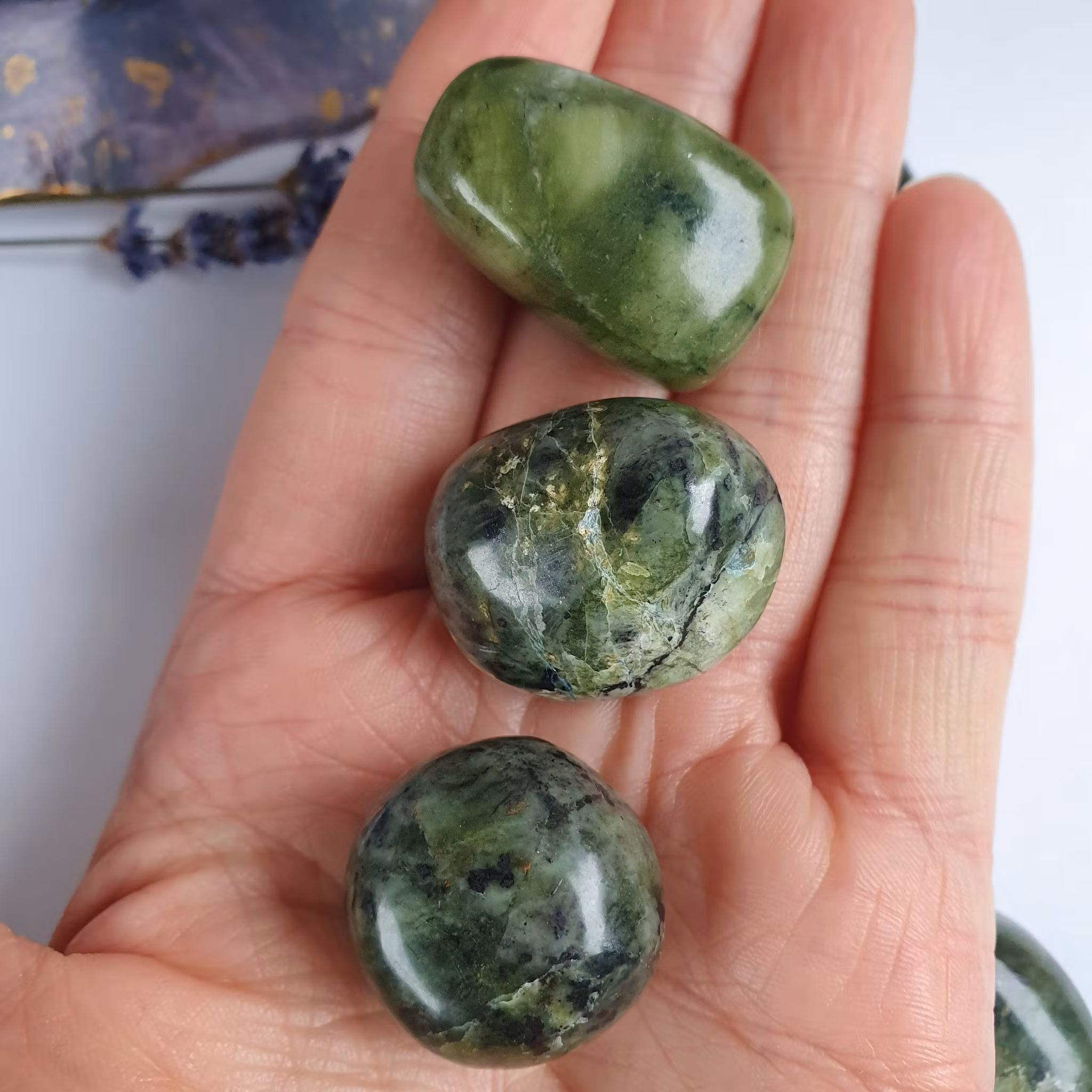 Fina trumlade bitar av Serpentin. Oftast så används tradenamet "Nefrite Jade" för denna sten men det är missvisande, därför väljer jag att använda dess äkta identitet. Vi väljer en fin sten åt dig.