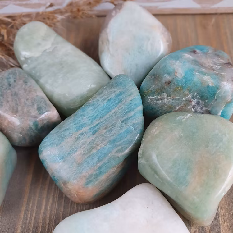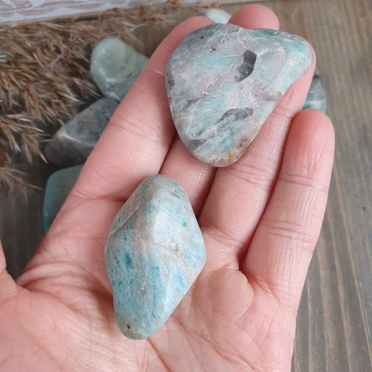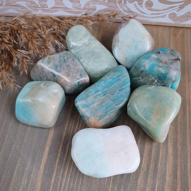 Större trumlade bitar av Amazonit i B-kvalitet. Vi väljer en fin sten åt dig.