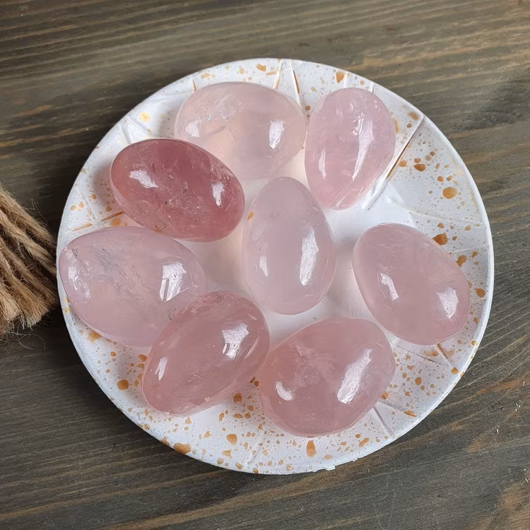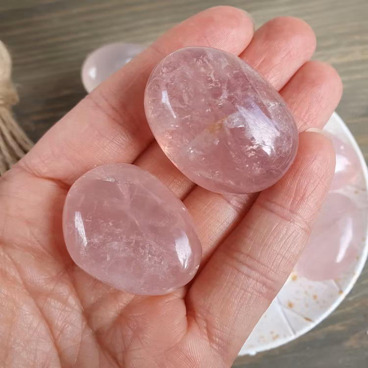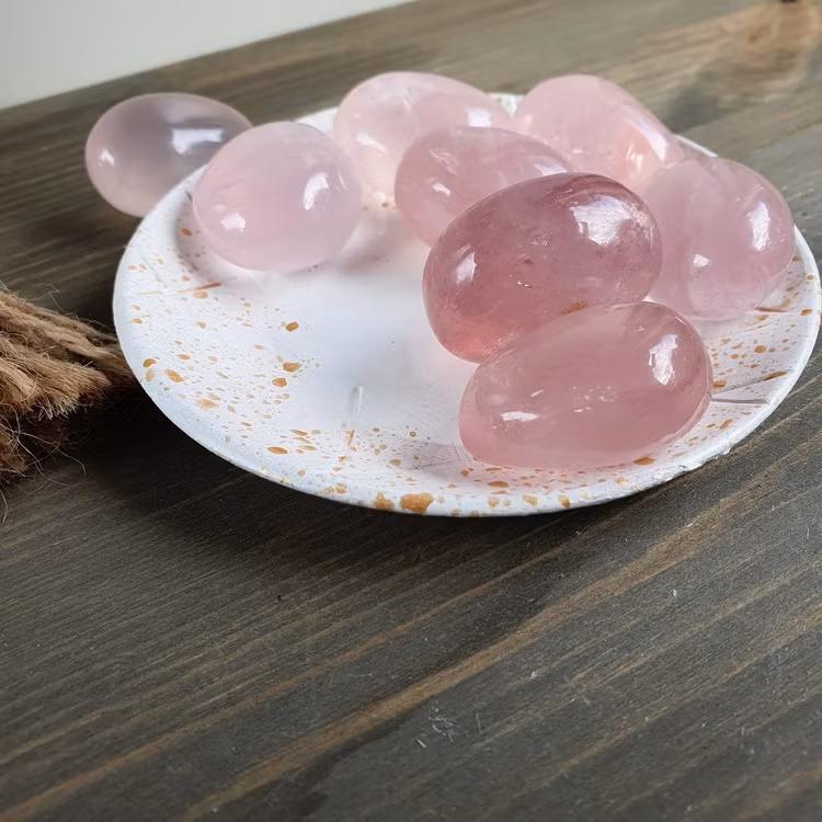 Fina bitar av trumlad Rosenkvarts från Madagaskar i a kvalitet, ojämnheter förekommer. En liten pebbleformad sten som ligger skönt i handen. Vi väljer en fin sten åt dig.