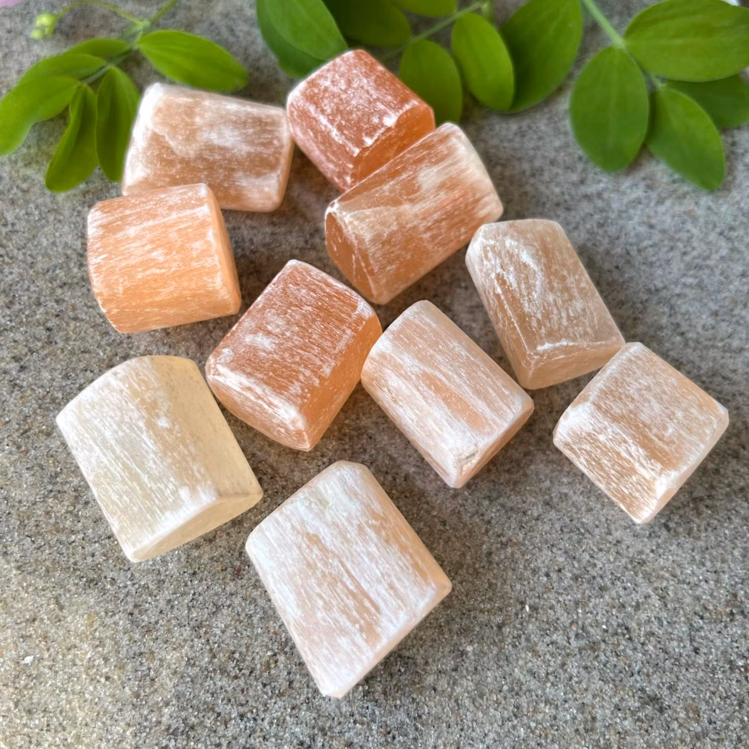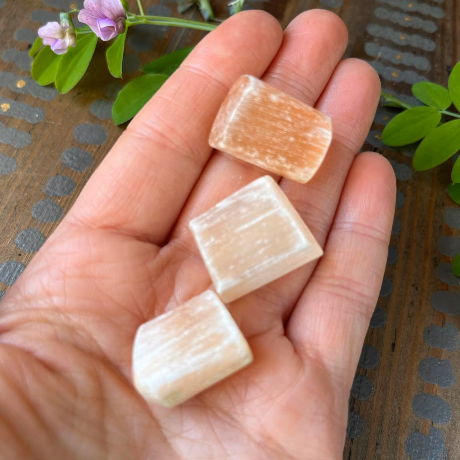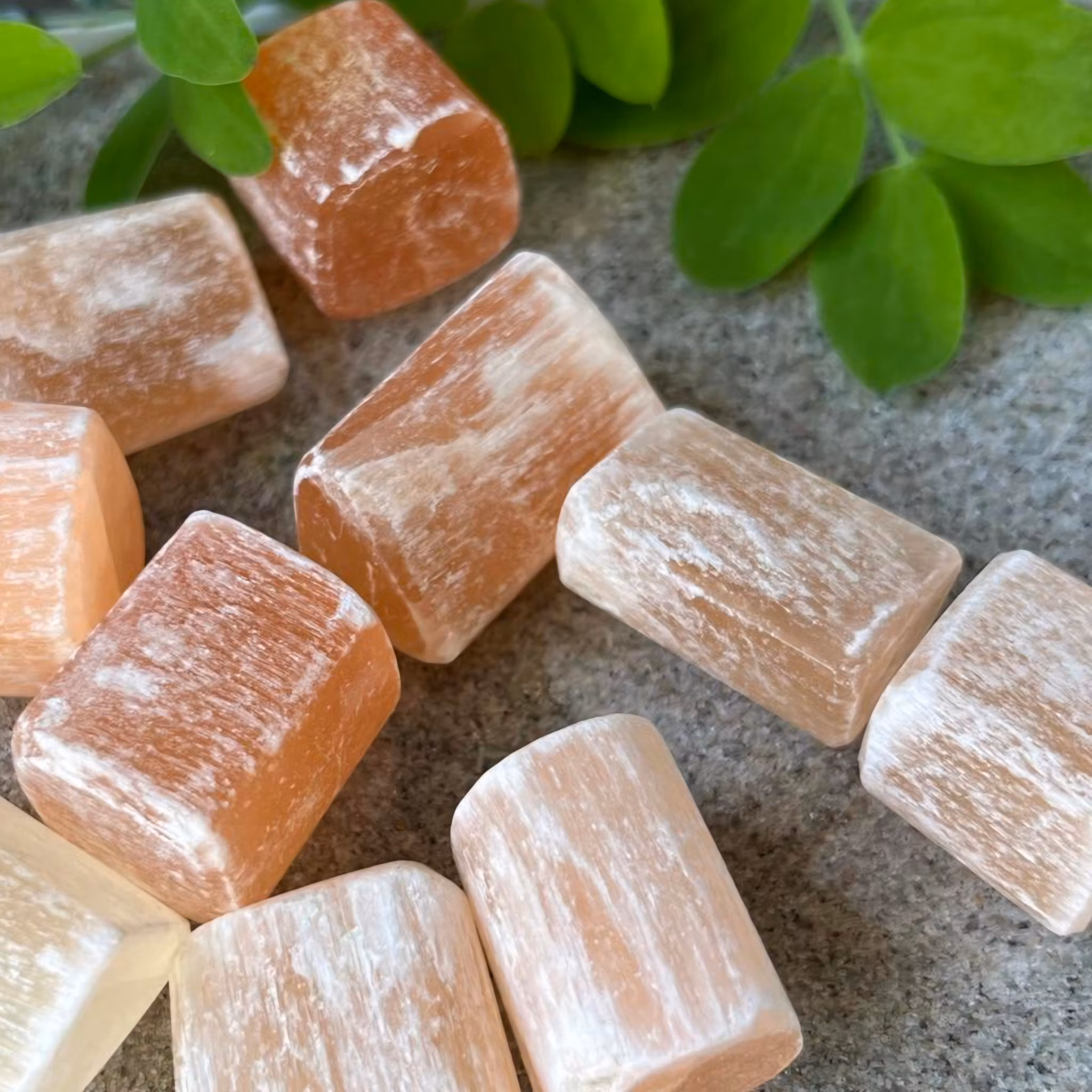 Lätt trumlad fin bit av Persikoselenit /Orange selenit, naturliga slitningar förekommer. Vi väljer en fin sten åt dig.