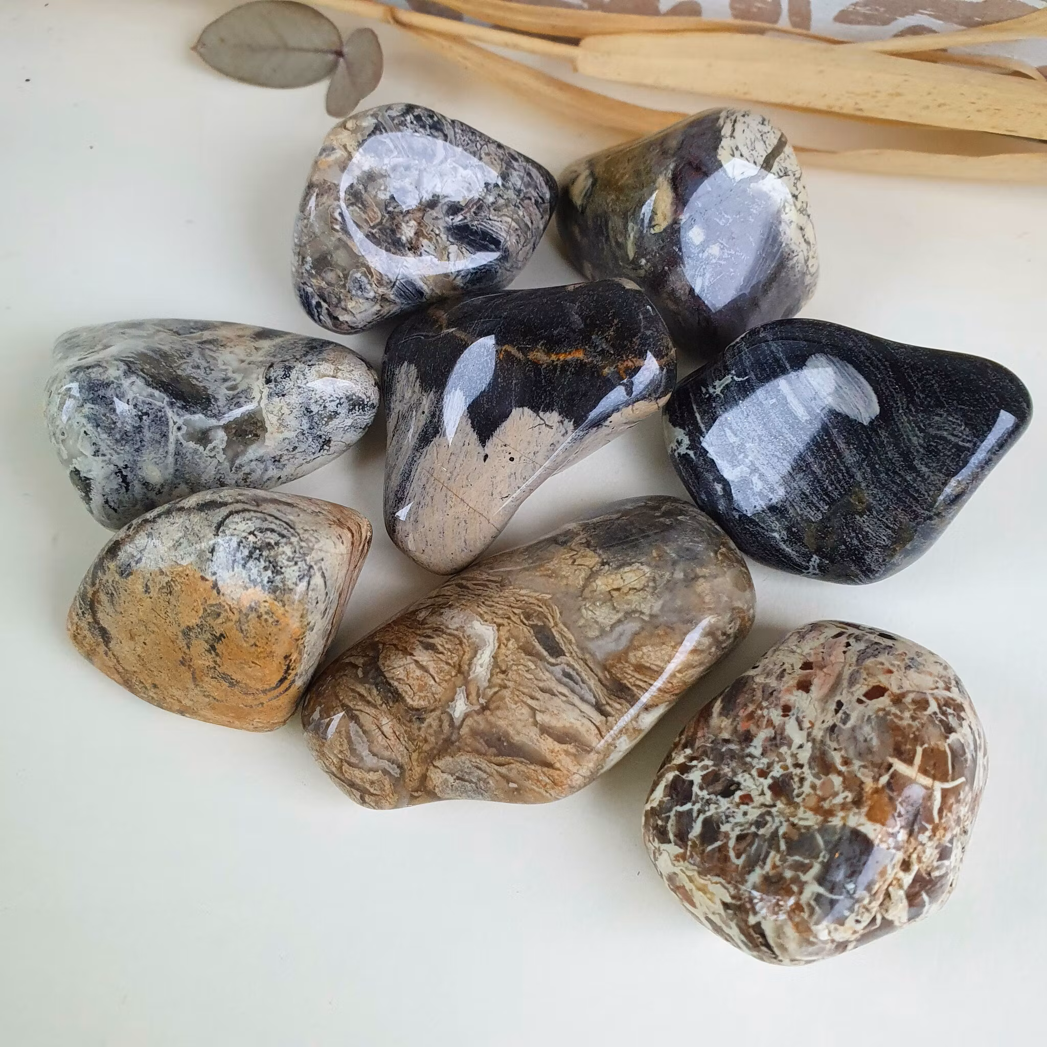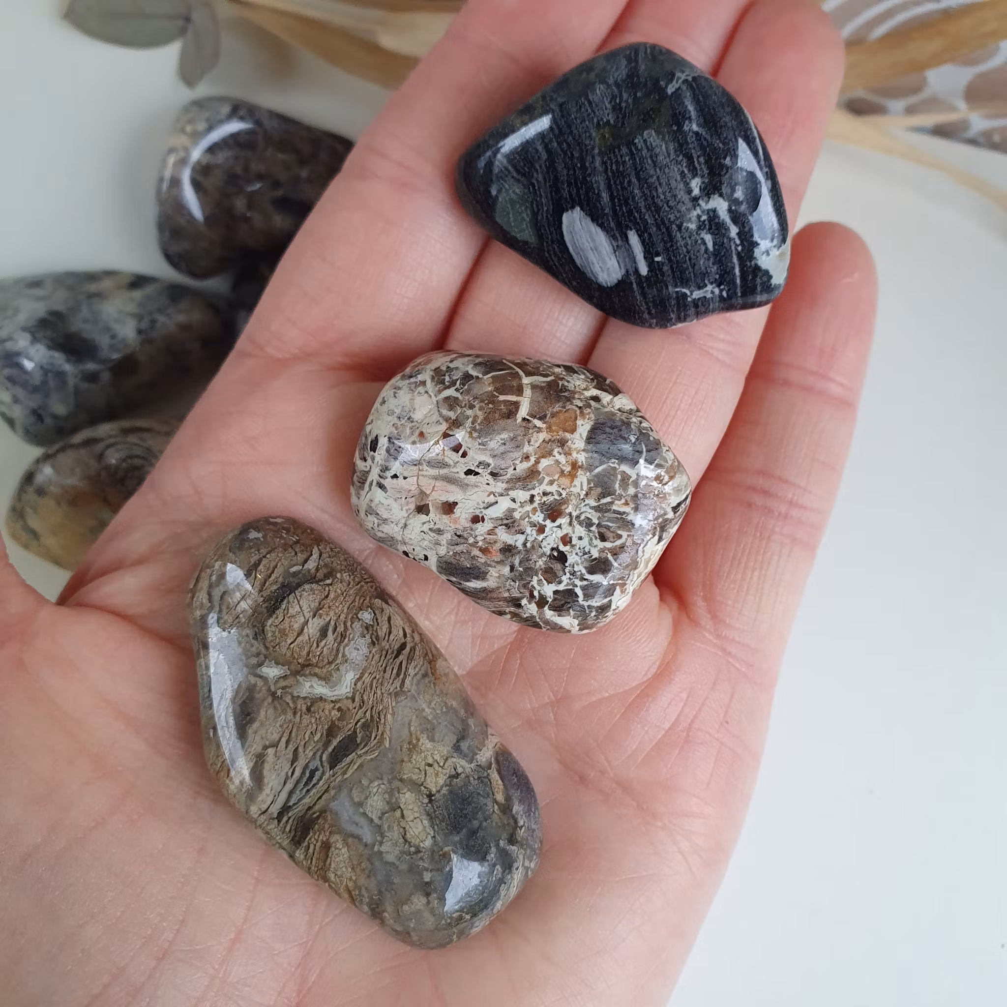 Fin trumlad bit av Silverlöv Jaspis. Naturliga ojämnheter förekommer. Vi väljer en fin sten åt dig.