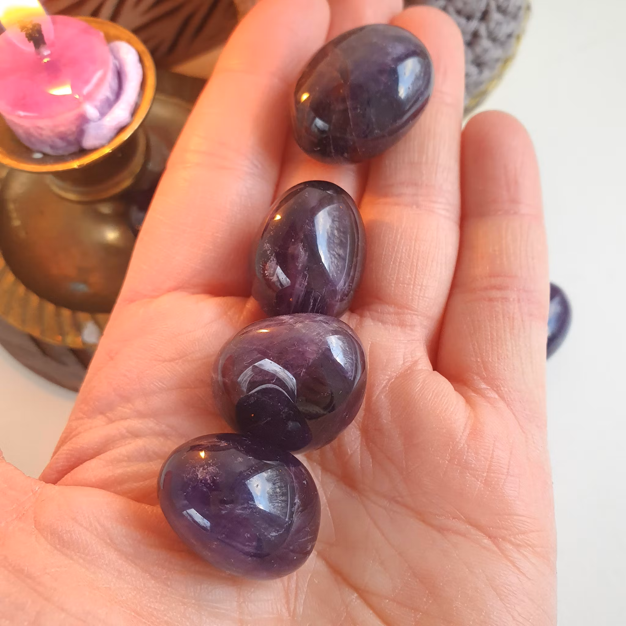 En liten ametist i pebbleform. Passar extra fint i spiralhalsband och ligger skönt i handen. Vi väljer en fin sten åt dig.