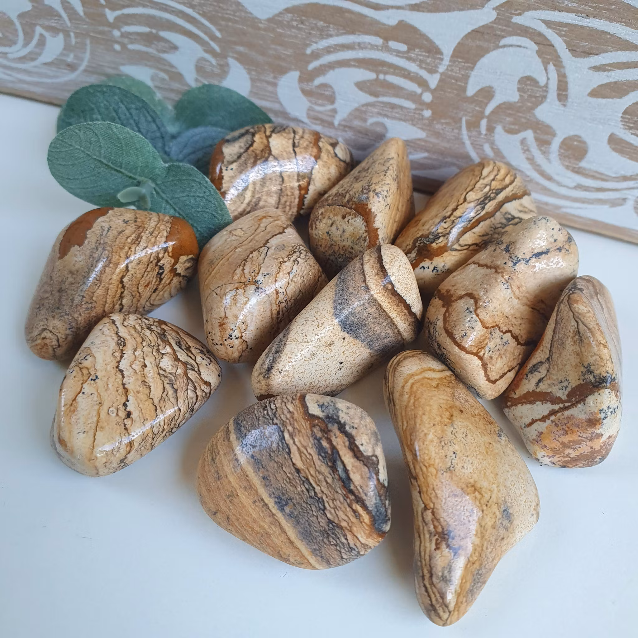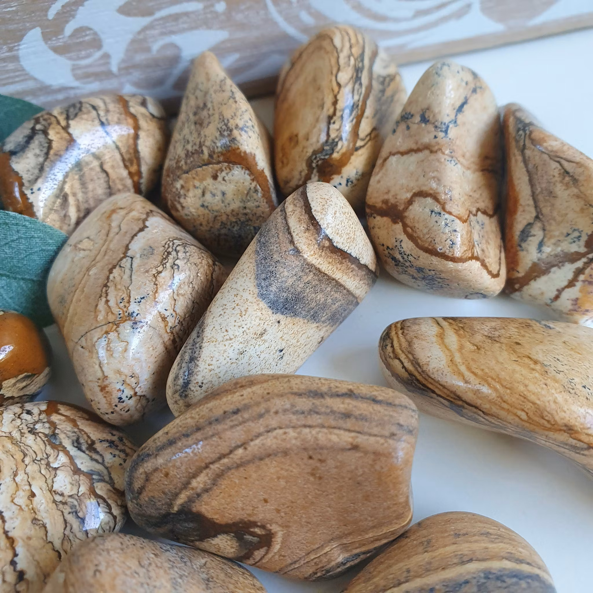 Fin bit av trumlad landskapsjaspis A kvalitet. Vi väljer en fin sten åt dig.
