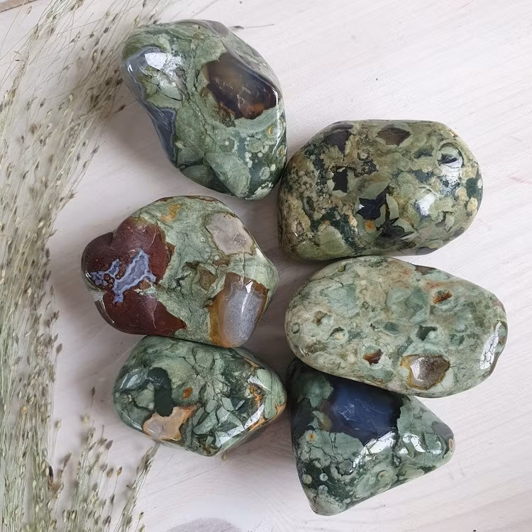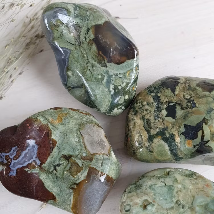 Fina trumlade bitar av Rhyolit i A kvalitet. Vi väljer en fin sten åt dig.
