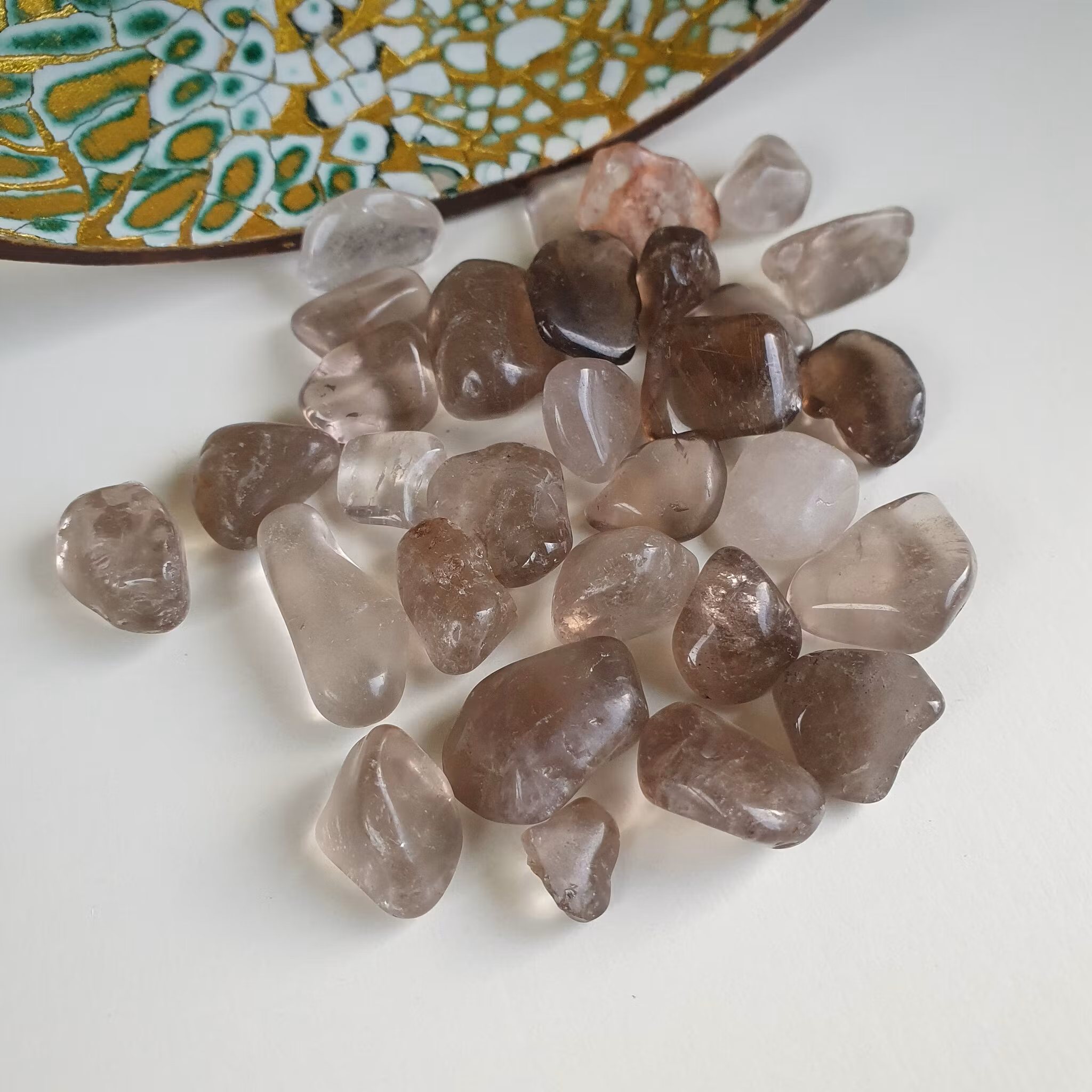 Trumlade små bitar av rökkvarts i B-kvalitet, i påse om 100 gr. För dekoration, kristallnät mm.