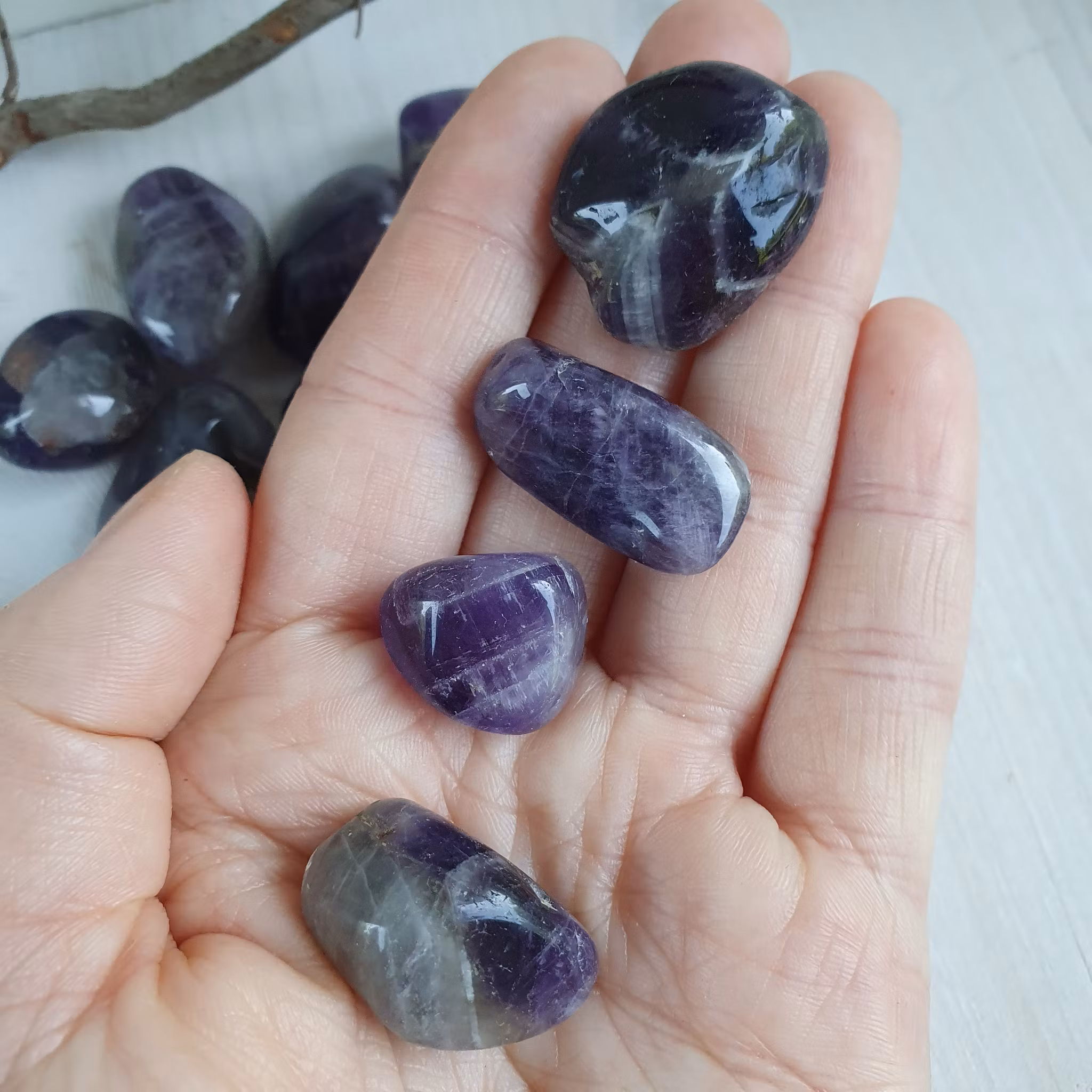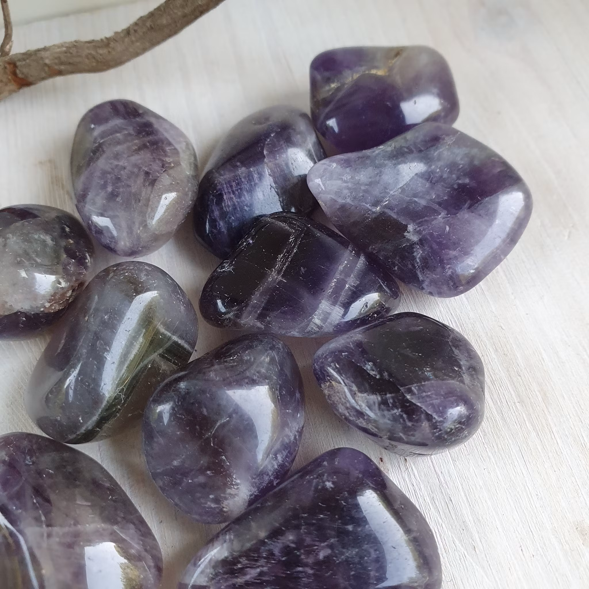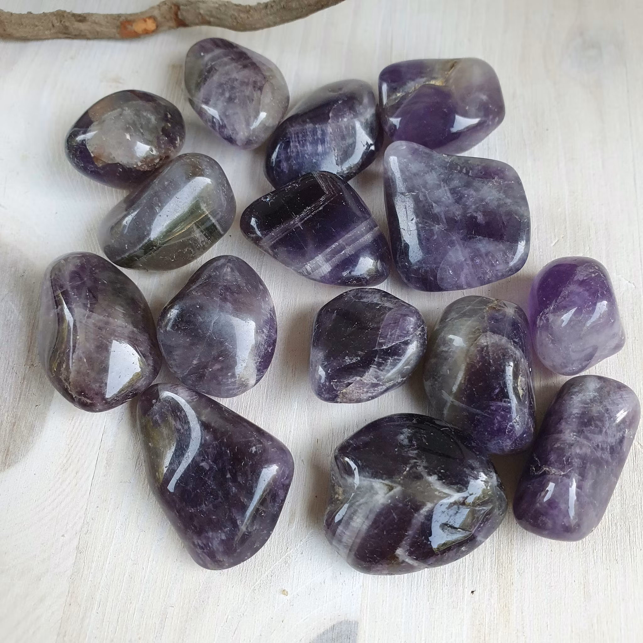 En trumlad ametist i B-kvalitet. Vi väljer en fin sten åt dig
